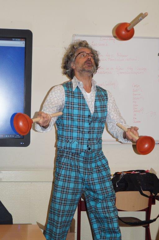 Zijn bezoeken gaan over verhalen, tekeningen, taal, normen en waarden, heldenmoed, ontdekkingen, dieren, kinderen en andere dingen. In tamelijk uitbundige sessies (mogelijk met fysieke publieksparticipatie) stimuleert hij de fantasie van de deelnemers, en neemt hij ze mee in het werk van een schrijver/tekenaar. Zijn optredens hebben een -goed voorbereid- improviserend karakter. En ze zijn leuk en leerzaam.
