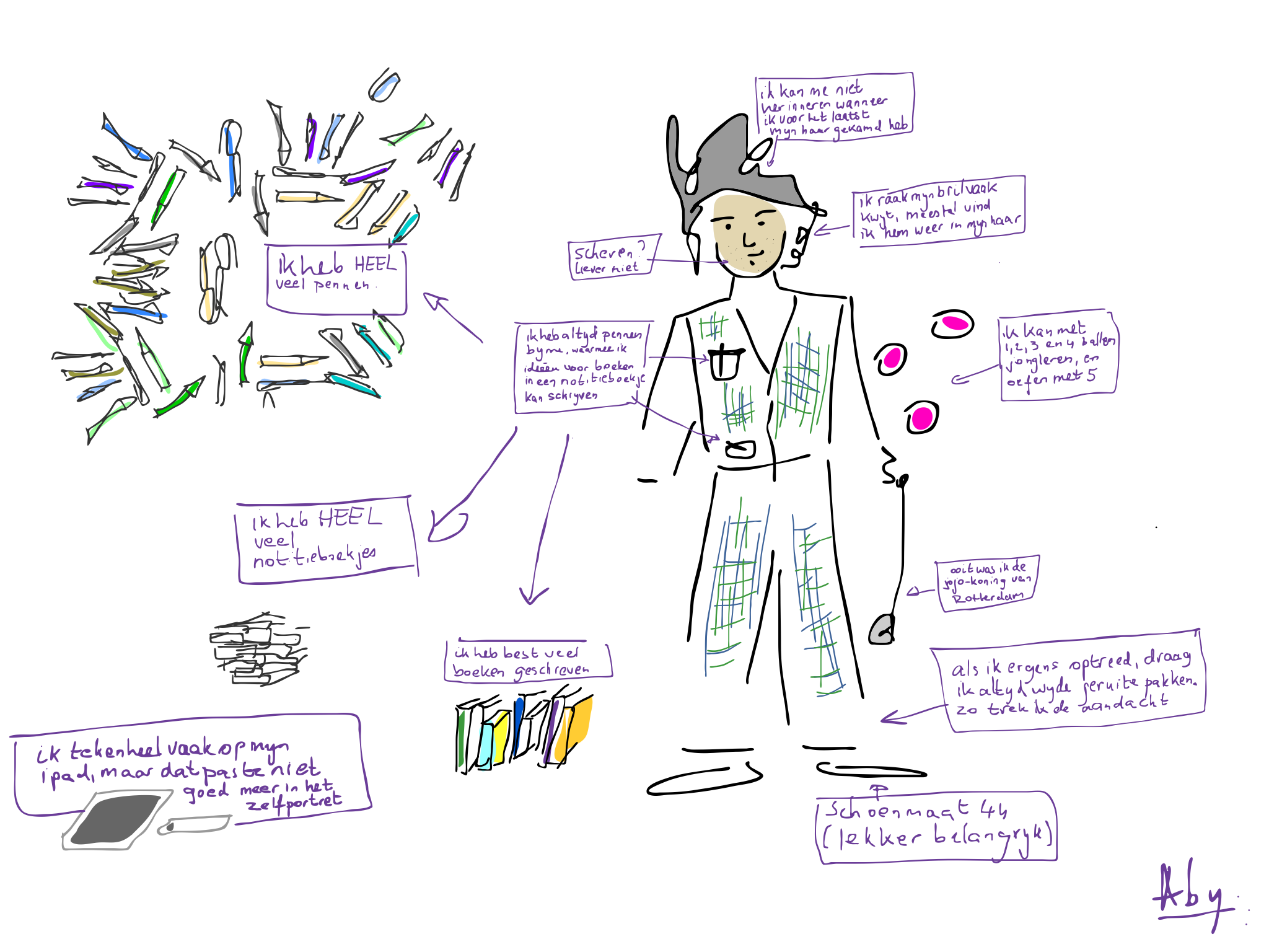 Naast FB en Bluesky heeft Aby ook een blog met combinaties van teksten en tekeningen voor volwassenen en een instagram-account vol tekeningen.