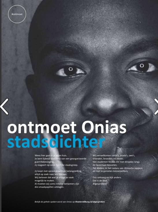Als voormalig stadsdichter van Tilburg (2017–2019) weet Onias als geen ander hoe woorden kunnen bouwen aan begrip en verbeelding. Zijn optredens en workshops op scholen zijn persoonlijk, krachtig en toegankelijk. Hij creëert herkenning door verhalen te delen die raken aan identiteit, roots, veerkracht en groei – vaak met een vleugje humor.